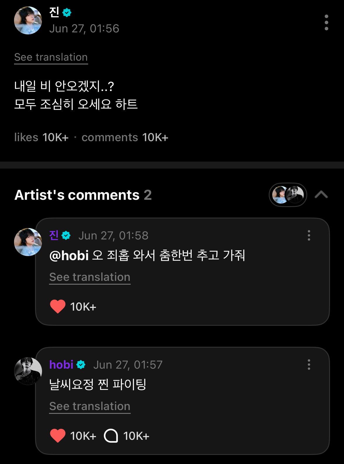 On the other hand, another member who is predicted to be on stage tomorrow is j-hope. Jin encouraged j-hope to attend his concert and even "dance" by writing: "Jwehope, please come tomorrow and dance" after j-hope cheered: "Weather fairy Jin, fιgнтing!".