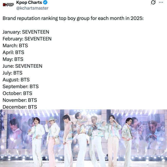 - So this is what people call the ‘2025 BTS downfall era’? BTS didn’t even do anything this year, yet they still ranked No. 1 in the Boy Group Brand Reputation Rankings throughout 2025, all the way through December.