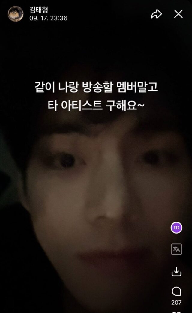 With the successful launch of the feature, V wasted no time in looking for idols outside of BTS to interact with and test it out. He posted a moment on Weverse, attempting to recruit other idols with the caption: “Looking for other artists to hold a livestream with that’s not the members.”
