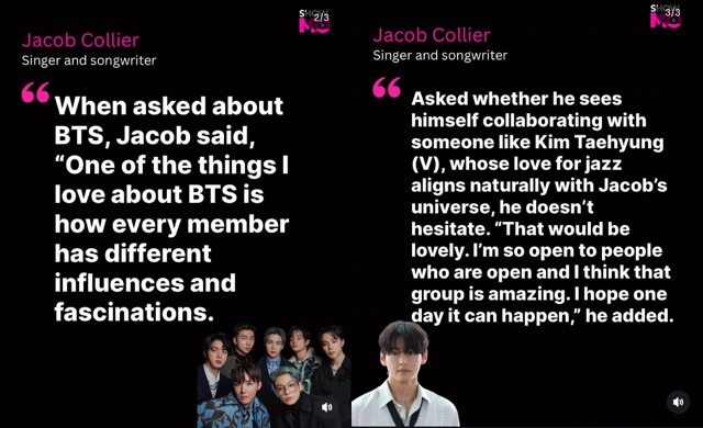 Musically speaking, Jacob Collier and V — or BTS as a whole — share many similarities. All of them are artists capable of producing and performing their own music and are deeply committed to artistic and musical integrity. While Collier is known for his complex harmonies and wide-ranging musical palette — spanning jazz, soul, R&B, pop, funk, clαѕѕical, gospel, and electronic — BTS are no less versatile, having explored all these genres throughout their decade-long career.