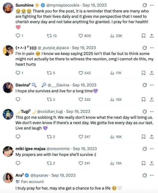 - Oh my I started tearing up as soon as I read it. This is so painful, I really hope she can overcome ¢αи¢єя now and has seen what BTS is doing
