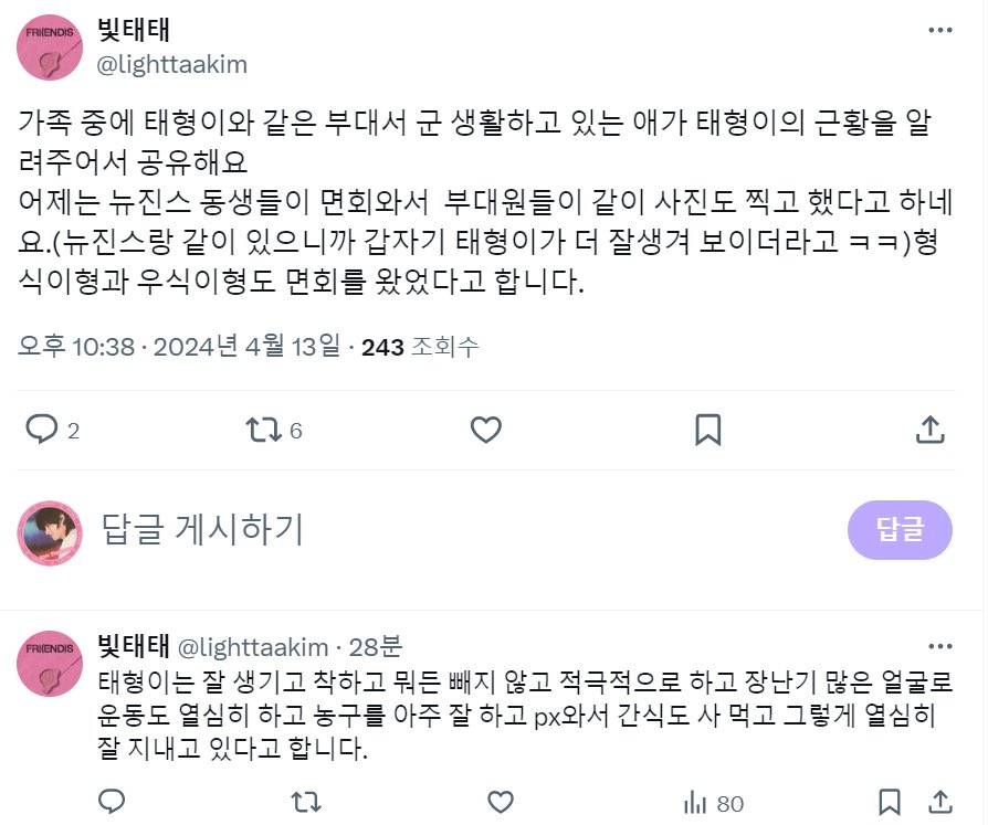 Specifically, OP wrote in the viral post: "A family member served in the same military unit with Taehyung tell me about Taehyung's current situation. New Jeans came to see Taehyung (Taehyung suddenly looked even more handsome because he went with New Jeans ㅋㅋ ) and they took pictures with the troops together. Hyungsik and Wooshik also came to see him. Taehyung is kind and does everything proactively. He has a cheerful face, works out hard and is very clever at playing basketball. He often comes to the PX (market in the military), buys some snacks and he is fine."