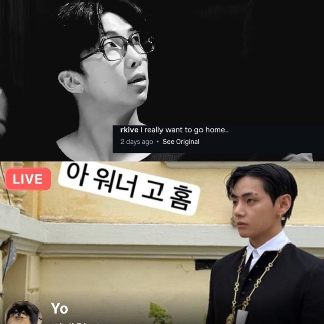 Specifically, on August 6, V held a voice-only livestream on Weverse Live, with a thumbnail showing him in a black suit and the words “I wanna go home.” Just two days earlier, RM had posted four photos on Instagram with the nearly identical caption: “I really want to go home.”
