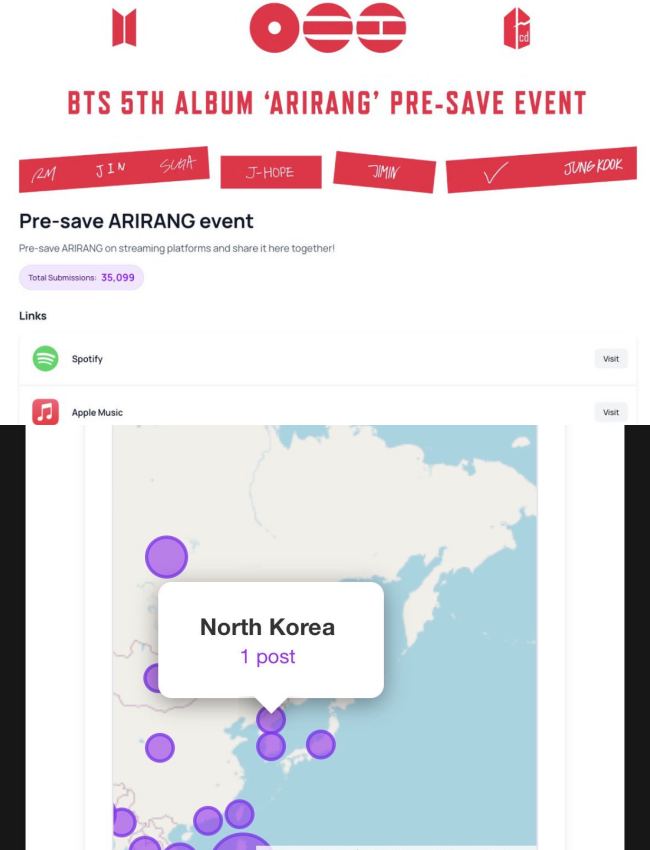 Yet, within this extremely tense context, there emerged a remarkably daring ARMY whose actions ѕнσ¢кed the entire fandom after they were seen expressing support for BTS ahead of the group’s return with the ARIRANG album. Fans discovered this “exceptional case” while accessing a fan-created application that tracks album presaves counts on Spotify and Apple Music. According to the data displayed, one presave clearly originated from “North кσяєα.”