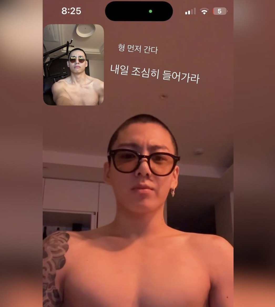 But of course, V is very good at making fans have emotional turmoil when the photo was released showing the two with shaved heads, wearing sunglαsses and t0pless, looking at each other. However, fans also saw a more notable detail: when they made the call, V's phone only had 5% battery left and they called each other at 8:25 a.m. (KST time). It seemed to be the last chance for the two to talk before they couldn't see each other for the next 18 months.