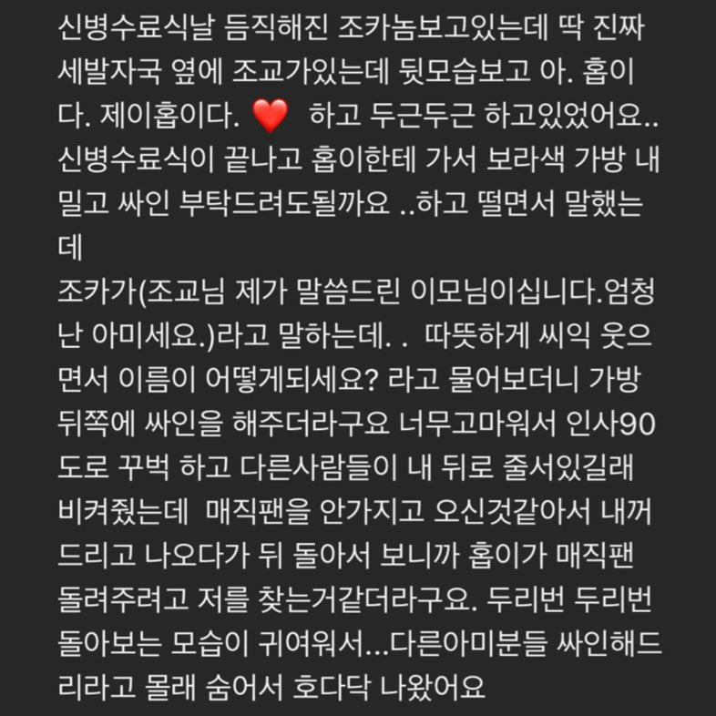 After the graduation ceremony, I went to Hobi, showed my purple bag and asked in a trembling voice, “can I ask for your autograph?” and my nephew said to him, “Jogyo-nim(Training Instructor-nim), this is the aunt that I told you about. She is a tremendous ARMY.” Hobi warmly grinned and asked, “May I have your name, pls?” and signed the back of the bag. Feeling so grateful, I bowed at a 90-degree angle and moved out of the way for those behind me in line. But it seemed like he didn't have a marker/pen with him, so I gave him mine and came out. When I turned around, I saw Hobi looking for me to return the pen. It was cute that he was looking around and looking around...I secretly came out so he could use the pen to sign autographs for other ARMYs."