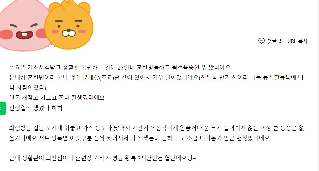 It was a life achievement of mine. Hihihihihi". But he also took note because a difficult training course awaited V and his colleagues. He continued: "They are scared about the chemical room training, but the gas concentration is low, so there will be no serious pain unless the bronchial tubes are seriously bad or you take a big breath. I also had a slight tear on the lower part of the gas mask, so the gas leaked, but I was okay except for a little sore eyes and nose