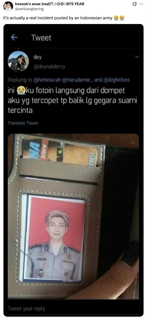 This humorous anecdote took place many years ago and involved an Indonesian fan, yet it has recently been brought up again by ARMYs. The story continues to charm fans, particularly the photo that helped the fan recover their belongings. Some fans could not help but remark that Namjoon edited into a ρσℓι¢є uniform looked incredibly realistic, and that his face alone carried enough authority to intimidate the thief.
