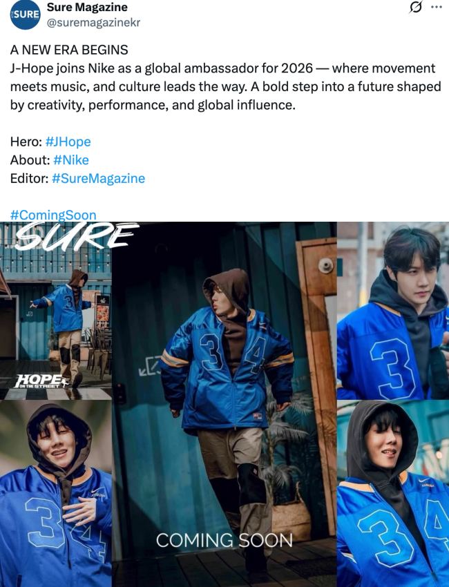 Specifically, on the 13th of this month, veteran кσяєαn fashion publication SURE Magazine posted an article on its official X account, hinting that NIKE has selected j-hope as its next Global Brand Ambαѕѕador, with an official appointment expected to be announced in 2026.