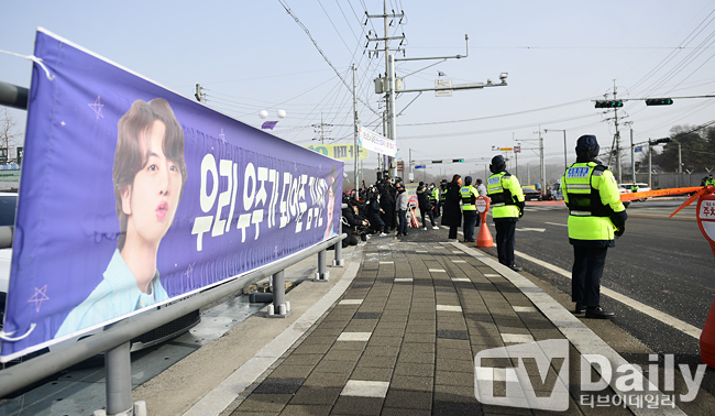 No more than 50 or so fans showed up on site, as Jin previously requested that fans respect other people and their families also enlisting on this day, and stay home rather than coming to see him off. However, numerous reporters from all over the globe surrounded the training center entrance, hoping to get a glimpse of the BTS member on his way in.