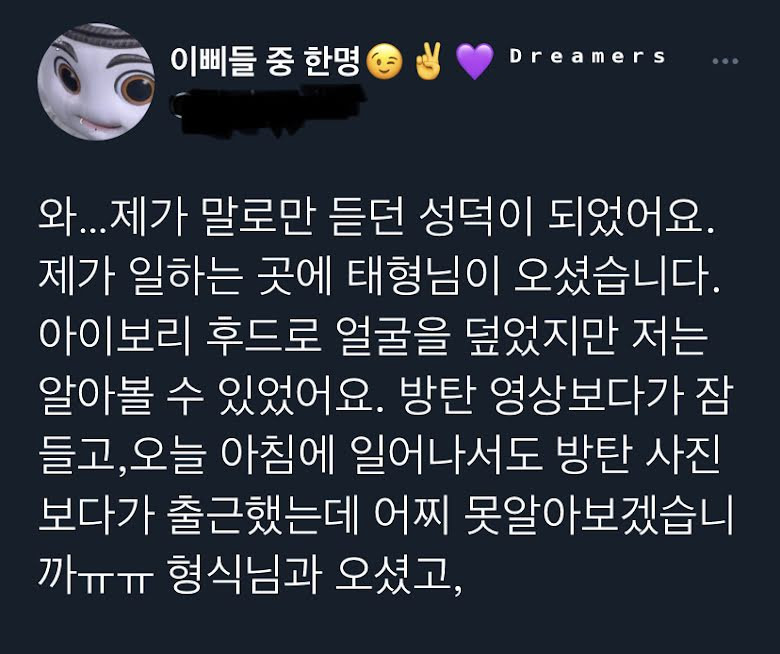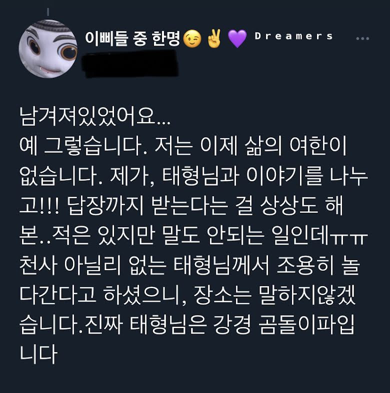 She said about it at the end of the post: "Yes I have no worries for the rest of my life now. I couldn’t believe that somєthing that I had only dreamed of had happened. To be able to talk to and receive a response from Taehyung! Angel Taehyung said that he would hang out here quietly so I will not reveal the name of the place. Taehyung is really a bear."