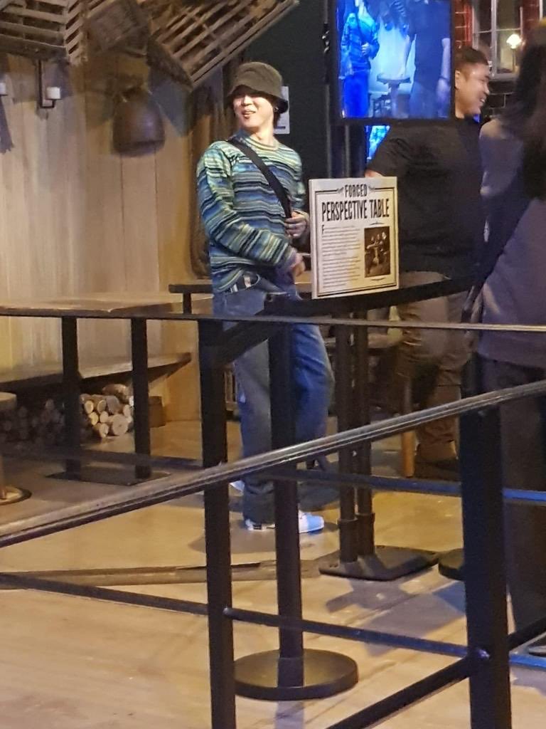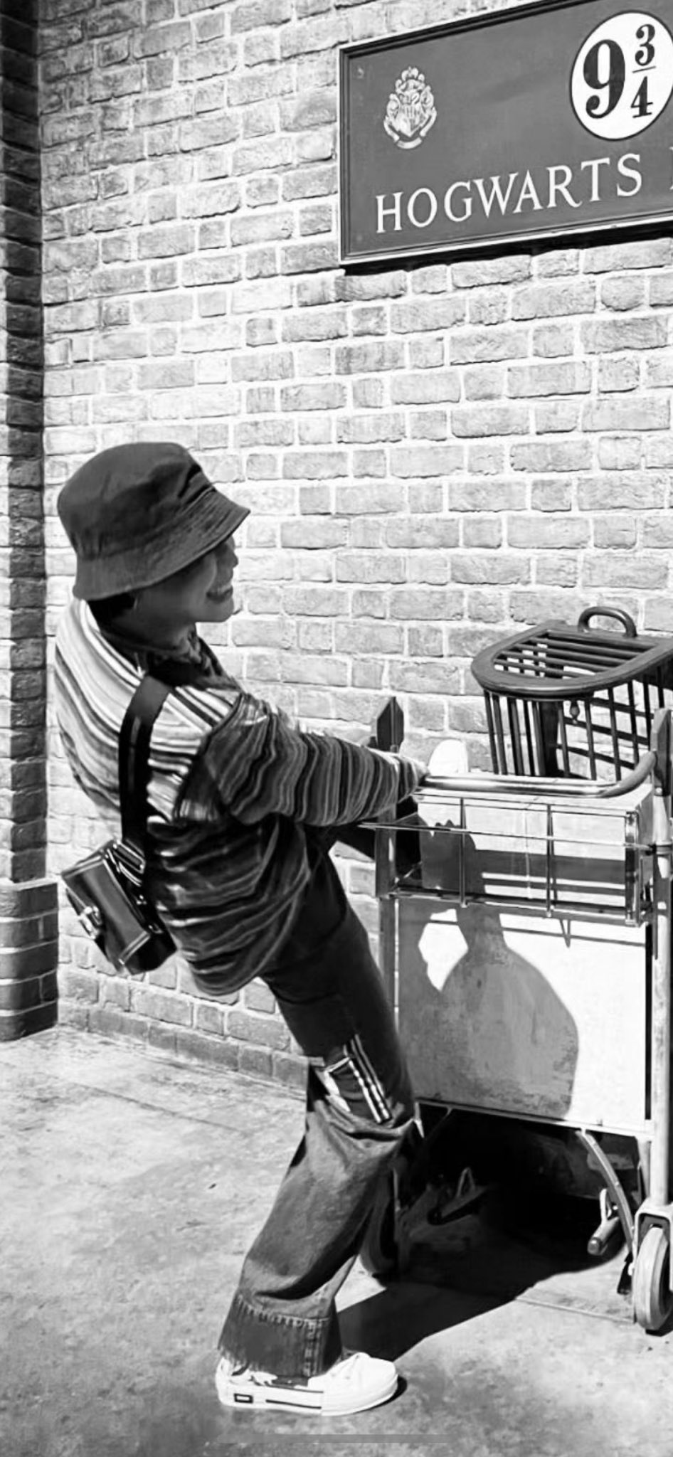 In it, there was a photo taken of the moment Jimin stood in front of Hagrid's Hutt in a suit similar to the one he wore at the airport. Jimin seems to have been very happy to visit the studio and he is also quite comfortable interacting with some of the fans who recognize him there.