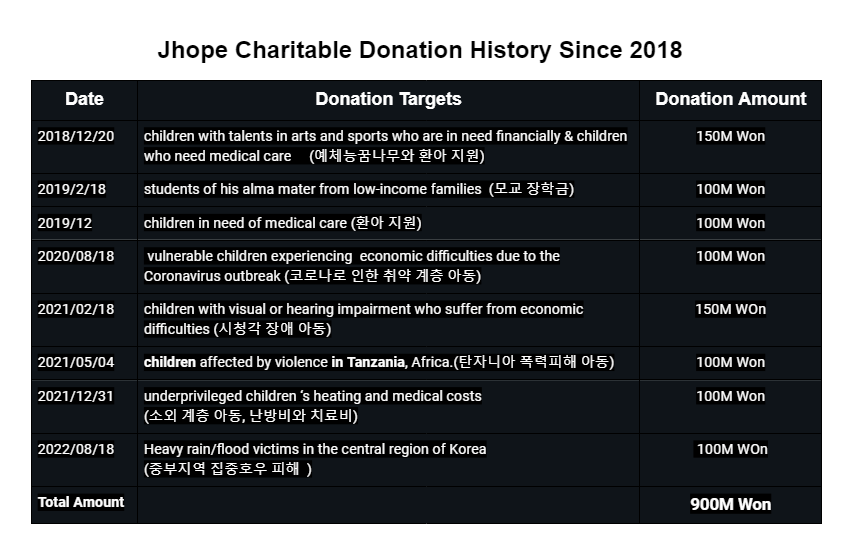 There have been many charities of j-hope over the years, such as 150 million KRW to nurture children's talents (in 2018), 200 million KRW in 2019 tuition fees, 100 million KRW in support of families in difficult circumstances because of Covid-19 in 2020,…