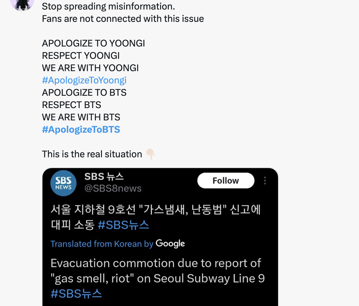 - Stop spreading misinformation. Fans are not connected with this issue APOLOGIZE TO YOONGI RESPECT YOONGI WE ARE WITH YOONGI