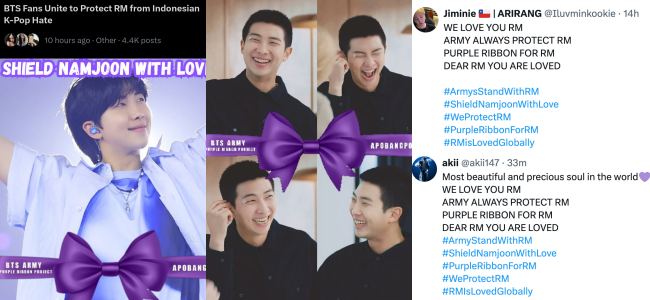At this point, ARMYs could not remain silent while RM was subjected to such unwarranted hostility. Fans worldwide organized coordinated online campaigns to counter the criticism. Hashtags such as #PurpleRibbonForRM, #ArmyStandWithRM, #ShieldNamjoonWithLove, #WeProtectRM, and #RMIsLovedGlobally trended on X. Along with these, edited images of RM featuring purple ribbons—a symbol previously used by fans to express protection and solidarity with BTS members—were widely shared.