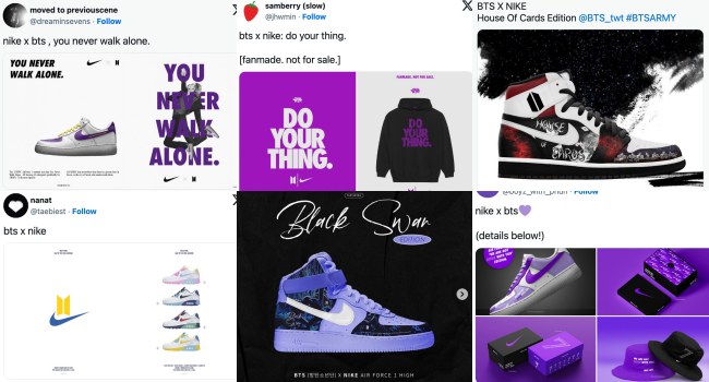 Around 2021-2022, BTS x NIKE topped the ARMYs' wishlist to the extent that a trend emerged where fans created their own BTS x NIKE merch. Air Force shoes, hats, and shirts using a purple primary color tone combined with the NIKE logo were shared on social media and looked extremely eye-catching. The posters were even meticulously made, making many people mistake them for real collaborative product advertisements.