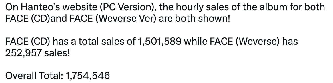 In fact, fans discovered another statement with data on Hanteo's website. This data shows the recorded sales of 1.75 million copies of FACE on March 24, 23:35 KST. It was the chart’s app version that reflected the smaller number.