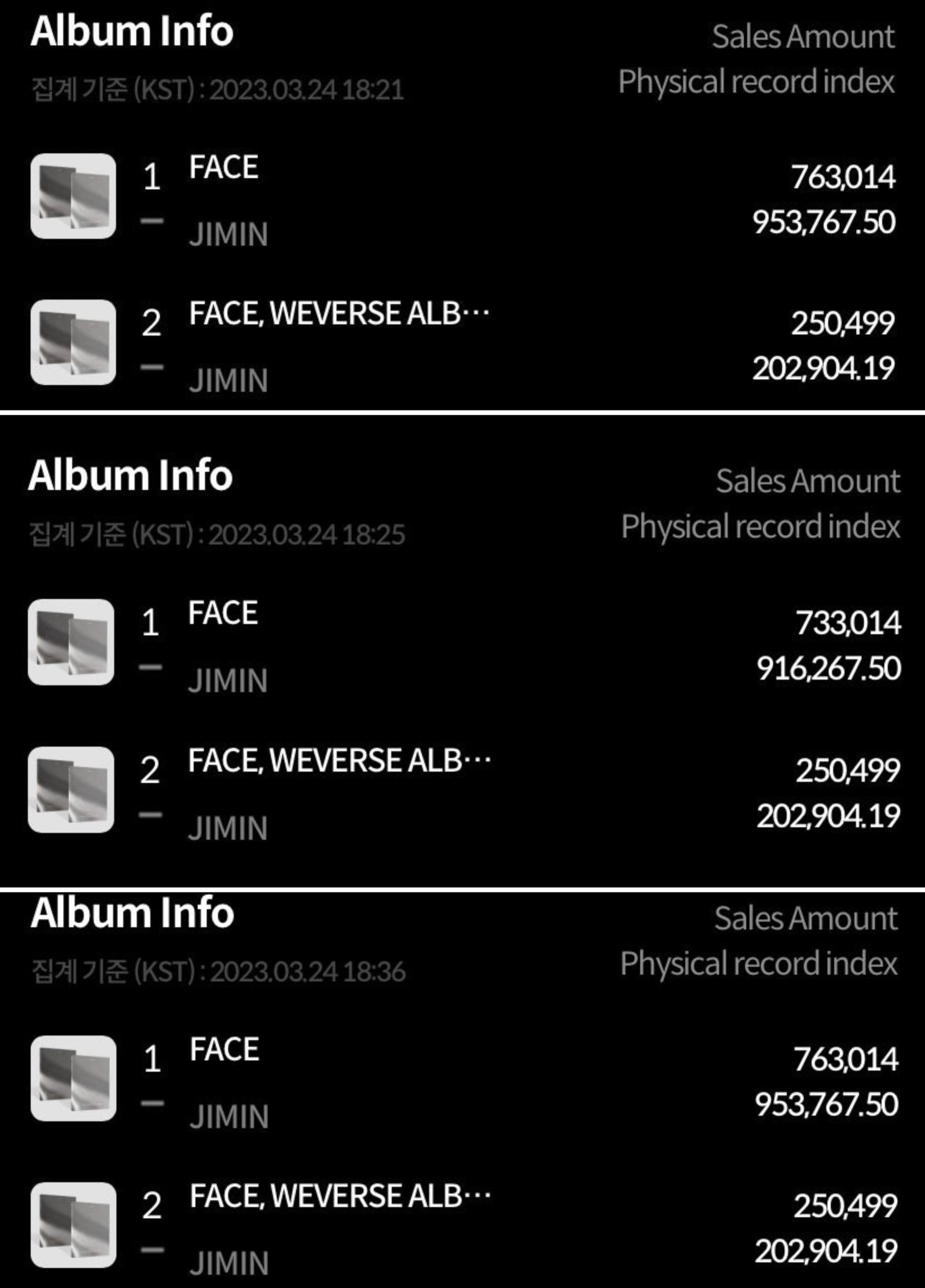 When ARMYs started wondering about this discrepancy, Hanteo released a statement saying that they had looked at the sales data and that FACE had apparently sold 991,437 copies as of March 24, 23:35 KST. However, this chart does not provide any explanation for the loss of copies in the previous hours.