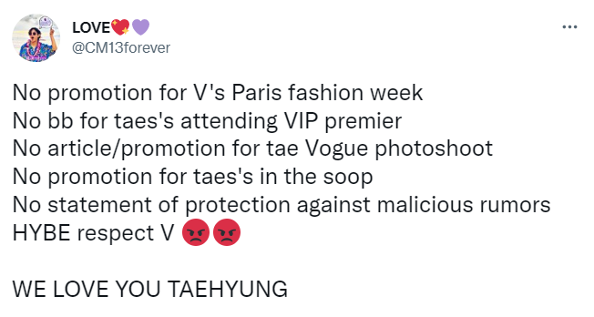 Most recently, many fans reacted strongly after HYBE did not take active measures to protect V through dating rumors. Fans have shown a lot of evidence of the rumor mills invading the artist's privacy while the management company did not take any action to prevent the bad guys.