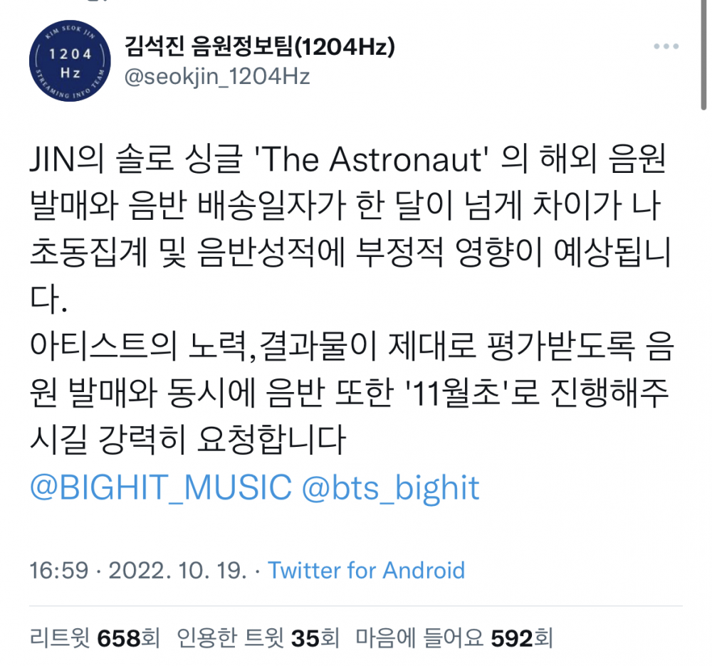They wrote, "Jin's solo single 'The Astronaut' album performance is expected to be affected negatively, as well as the Initial first-week sales count because the release date of the album overseas differs by more than a month. We strongly request that the album be released in 'early November' at the same time as the music release so that the artist's efforts and results can be properly evaluated."