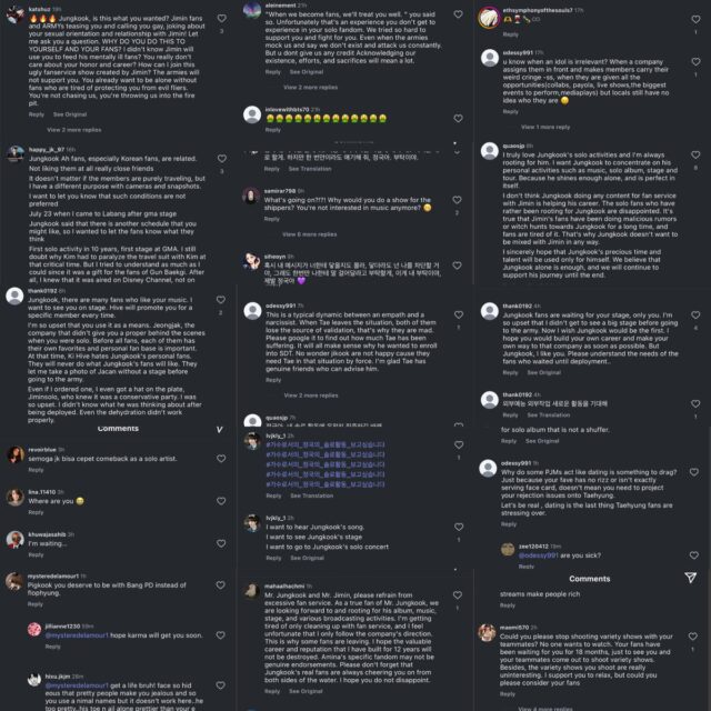 However, in contrast to the excited reaction of the majority of the fandom, some “fans” expressed anger at Jungkook working with Jimin more than focusing on his solo career. Since Jungkook does not have a personal Instagram, they flooded Bam’s account and attacked all of his posts.