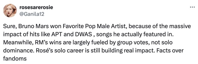 The awards ceremony was discontinued after the 2022 event and was held again in 2025 after three years. This year, BTS is nominated as solo artists including RM and Jimin in the category of "Favorite K-Pop Artist", alongside many other prominent Kpop artists such as BLACKPINK Rosé, Stray Kids, ATEEZ, etc.