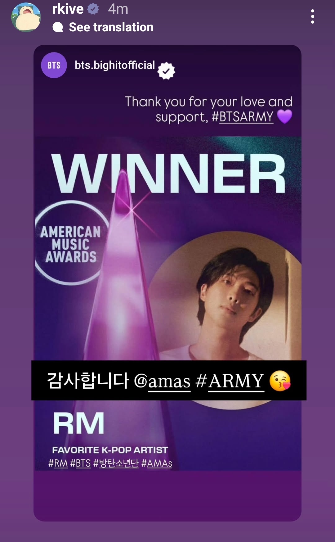 Finally, on the 26th, the 'αмєяι¢αn Music Awards' held at the Fontainebleau Hotel in Las Vegas honored RM as the winner of this year's 'Favorite K-Pop Artist' category. With this achievement, he became the first and only K-pop artist to win a trophy at the 'αмєяι¢αn Music Awards' as a group member and a solo artist.
