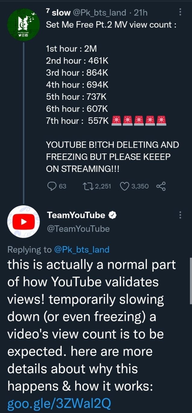 - Hello @TeamYouTube,IF it validates views, and then adds them later, why do you delete them? You did this many times with “set me free pt.2”MV by BTS JIMIN which was released yesterday & all BTS MV , add the views back to “set me feee pt.2” & don’t freeze views