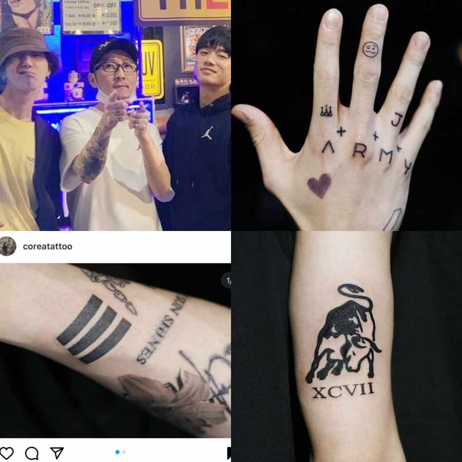 Sagimi did the first Jungkook's tattoos like: J, ARMY, crosses, purple heart, crown, smiley, ARMY symbol, rock sign, the quote, his birth flower, truth, Chinese hieroglyphs, please, bull, flag, and the mask.
