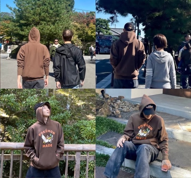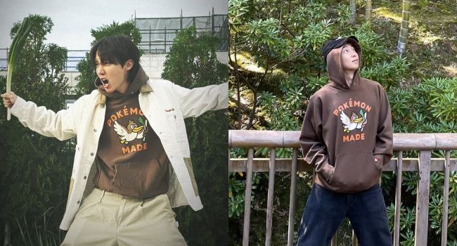 Recently, fans discovered yet another example: the ‘94-line’ best friends, RM and j-hope, were seen wearing the same cute brown hoo∂ιє in their latest Instagram posts — the Human Made x Pokémon Heavyweight Hoo∂ιє (Brown).