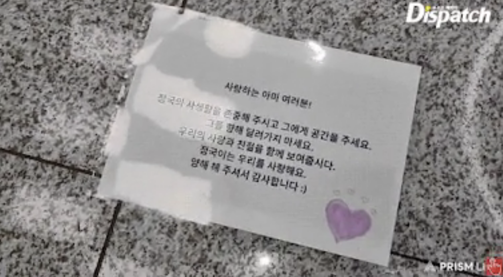 This project by Dispatch is aimed at those who waited for Jungkook at the airport in the hope of making his future experience at the airport safer. Not only that, they also posted papers with similar content in both English and кσяєαn in the media area and in front of the fan barrier, urging people at the airport to give Jungkook private space.