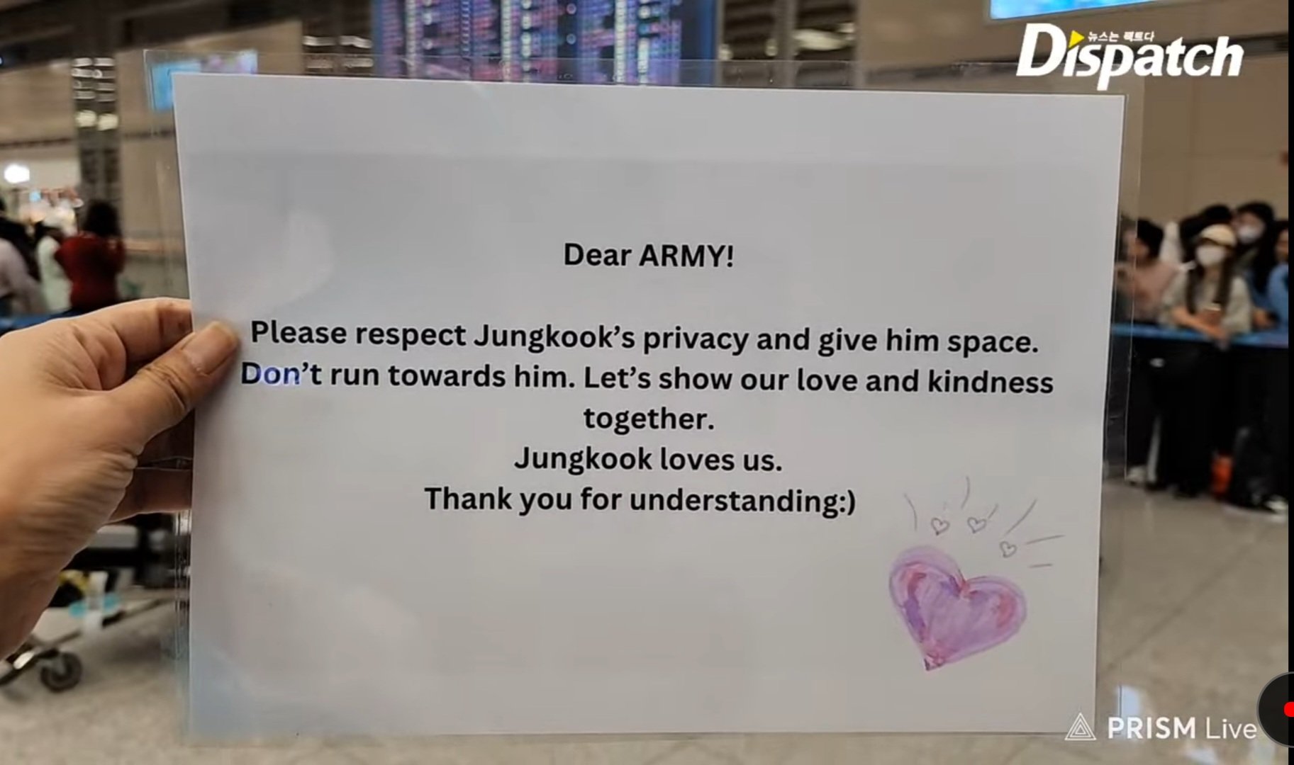 Specifically, on the day Jungkook returned to кσяєα after his schedule in New York, the Dispatch reporters present there held banners with the content: "Dear ARMY! Please respect Jungkook’s privacy and give him space. Don’t run towards him. Let’s show our love and kindness together. Jungkook loves us. Thank you for your understanding!"
