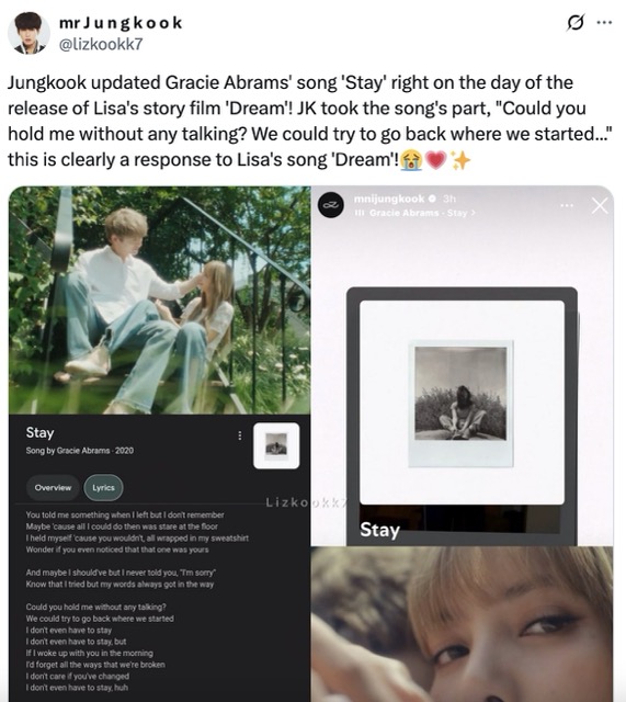 However, some fans linked this with the timing of Lisa’s release of the MV Dream, marking her latest solo activity. They claimed that Jungkook choosing the exact lyric: “Could you hold me without any talking? We could try to go back where we started…” was a “response” to Lisa’s song Dream.