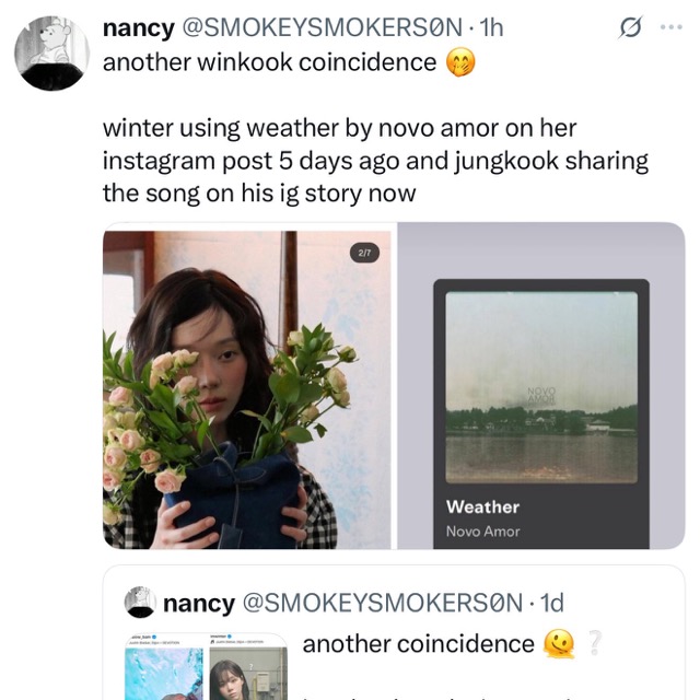 Not stopping at Lisa, Jungkook continued to be linked with Winter (aespa) right after that. After the Stay story, he again shared the song Weather by Novo Amor. Immediately, social networks appeared with many posts pointing out that Winter had also once uploaded this song on Instagram along with “7” personal photos, showing a “hidden connection.”