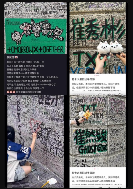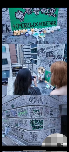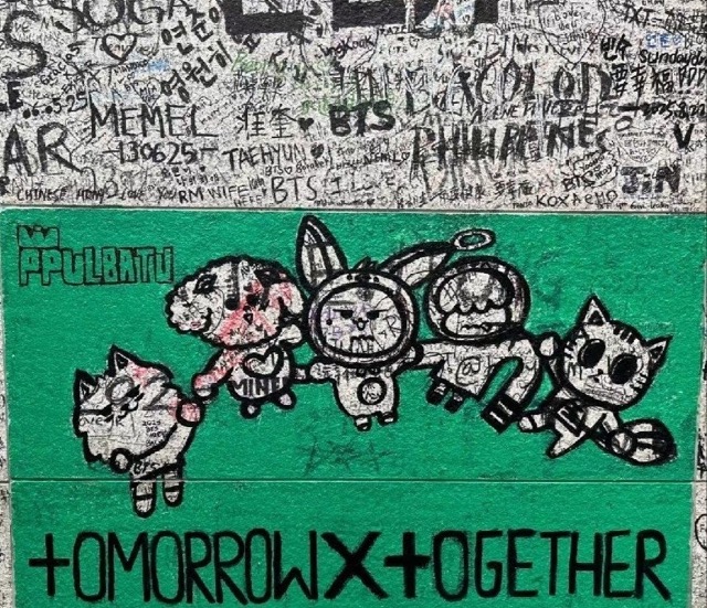 Specifically, the wall outside BTS’s old headquarters, which had long been a place where ARMYs left loving messages and memories when they visited the birthplace of the group, was recently discovered to have been painted over by a Chinese TXT fan, who covered these messages with green paint and added drawings of TXT’s character “PPULBATU.”