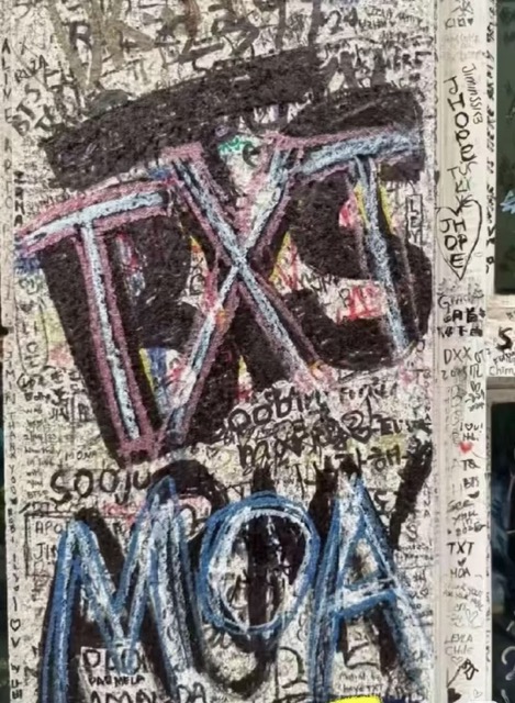 Apart from the striking green-painted area, there were also many other parts of the wall where heartfelt messages to BTS or BTS’s symbols were overwritten with TXT’s symbols or phrases about the junior group.
