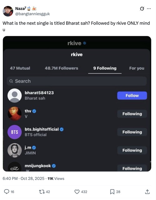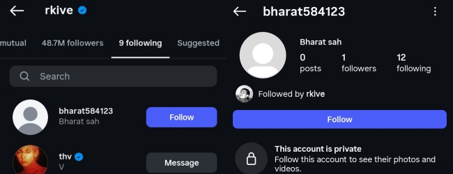 A few hours ago, the sharp-eyed fans noticed that the following count on RM’s Instagram account had increased by one, meaning he was now following nine accounts. The surprising part was that when fans checked the list, they found a very mysterious account: it had no profile picture, a strange ID — bharat584123 — and the name Brahat Sah, which didn’t seem to belong to any celebrity.