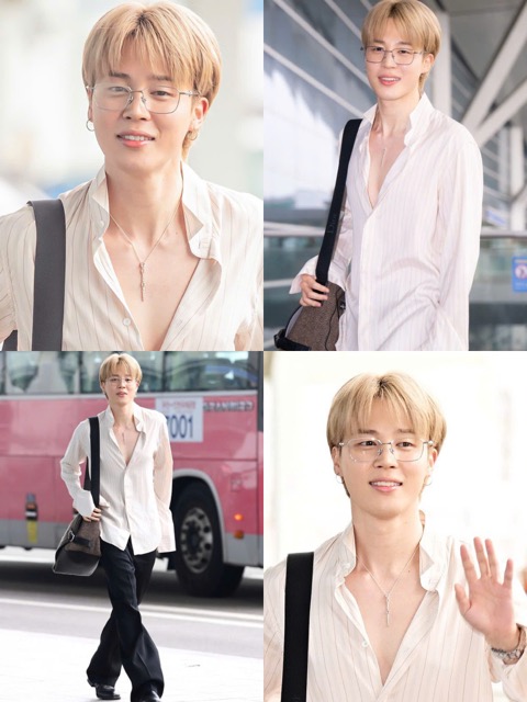 For accessories, he drew attention with thin-framed square glαѕѕes, a silver chain with a cross pendant, and an eye-catching metallic watch on his wrist that completed the look. Jimin’s practical style—finished with a black crossbody bag—embo∂ιєd the very essence of “airport fashion.” In particular, his blonde hair for this comeback also left fans thrilled.