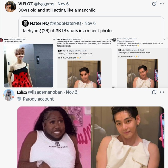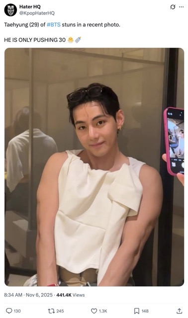 Specifically, on November 6, an X (formerly Twitter) account under the ID @KpopHaterHQ shared a post featuring a photo of V (originally posted by him on July 7) with the caption: “Taehyung (29) of #BTS stuns in a recent photo. HE IS ONLY PUSHING 30.” Notably, this account has a history of posting hateful content toward many K-pop idols, and nearly all BTS members have been targeted by similar attacks at least once.