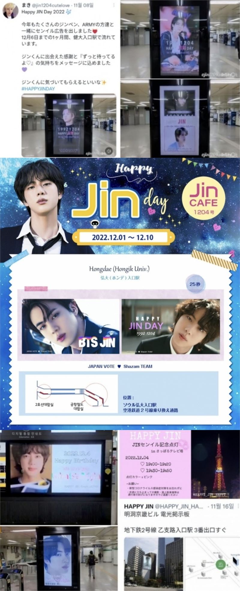 In particular, a video congratulating Jin on his birthday was also played at Konkuk University Station, a subway station near Jin's alma mater. The messages of ARMYs in the video include: 'Jin's happiness is our happiness' and especially "We will wait for you forever".