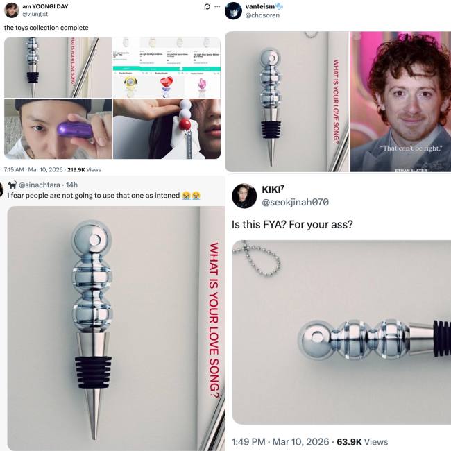 But even after the item’s real function was clarified, many fans continued to caution others not to use the wine stopper for any other “sensitive” purposes, jokingly reminding fellow ARMYs: "ARMY, repeat after me: It doesn't have a flared base", "FOR YOUR ALCOHOL ITS A BOTTLE STOPPER PLEASE DONT GO TO ICU", "ARMY please… it’s a wine stopper. For WINE. Not for experiments", "Guys please… HYBE made merch, not medical emergencies", "BTS said love yourself, not injure yourself",...