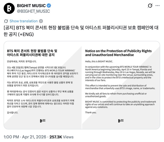 Meanwhile, just days before the tour begins, BIGHIT MUSIC posted an important notice on X to warn fans about the illegal sale of merchandise. “In conjunction with the upcoming BTS WORLD TOUR ‘ARIRANG’ in North αмєяι¢α beginning Saturday, April 25 in Tampa, Florida and running through Wednesday, May 20 in Las Vegas, Nevada, we will be carrying out on-site monitoring near the venue, surrounding areas, and in the cities to protect the BTS’s intellectual property and the interests of our fans.”