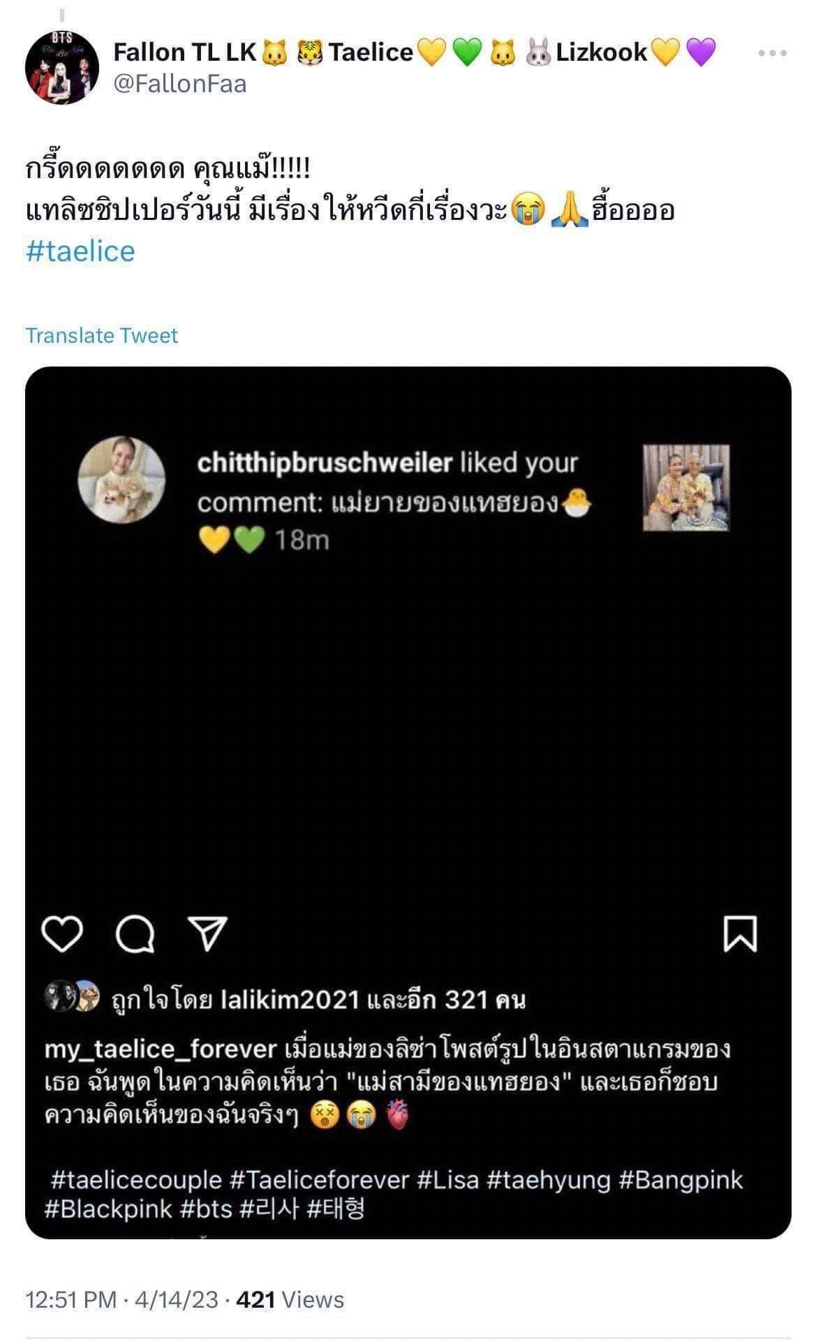 In this situation, fans have many different reactions. however some also mentioned that LISA's mom used to love a lot of different fan comments at random, so this should stay positive instead of hyping it up like many Taelisa shippers trying to turn it into stuff: