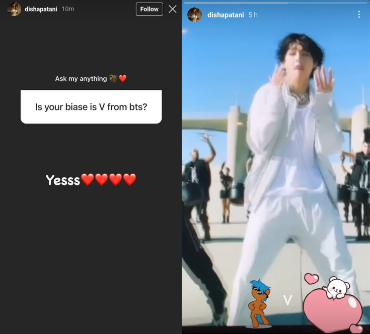 Disha Patani posted Taehyung's fancam videos on her Instagram story and shared that she is a fan of Taehyung. The fancams that the actress shared include 'Run BTS' and 'Boy with Luv'.