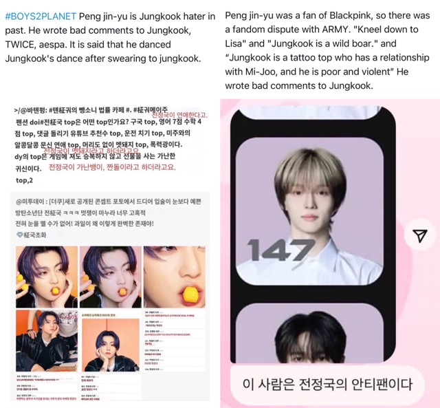 - Peng Jin Yu, is JK anti who wrote hate comments and was shady against jungkook and gg groups but he’s doing JK challenges right now to promote himself anyone who writes malicious messages against fellow idols should not be eligible.