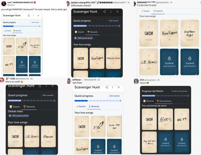 This marks the first time BTS has utilized a “treasure hunt” style promotional format on a global search platform like Google. The concept quickly generated widespread buzz as fans around the world shared screenshots of their achievements, showed off different cards they had obtained, discussed answers, and pointed out interesting hidden details within each mission.