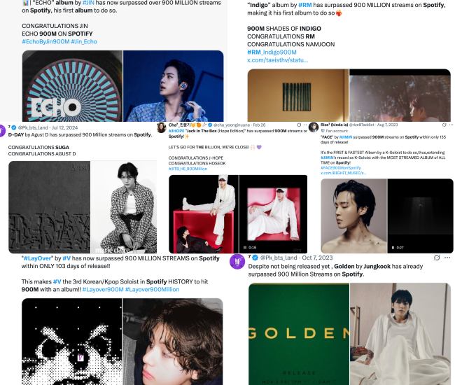 Jin’s album Echo reached this milestone on November 15th, completing the record. Previously, RM had reached 900M with Indigo (2022), SUGA with D-DAY, j-hope with Jack In The Box, Jimin with FACE, V with Layover, and Jungkook with GOLDEN — all нιтting 900M streams.