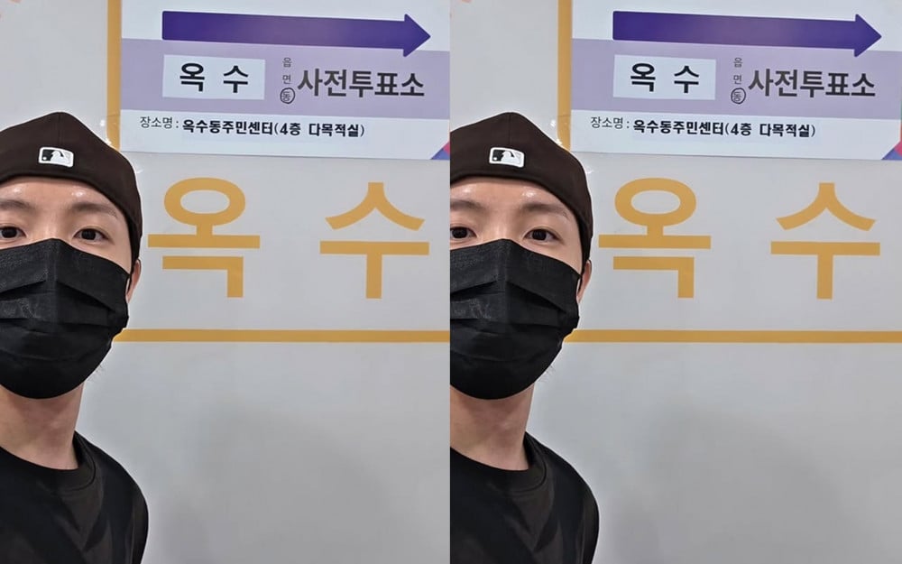 j-hope shared a photo revealing that he visited the polling station in Oksu-dong for the early voting period. One notable point is that j-hope wore a simple outfit, completely black from his beanie, mask to the T-shirt.