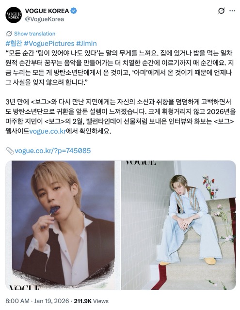 In line with the ongoing coverage, Vogue also released the digital edition of its exclusive interview with Jimin on January 19, introducing it with the following description: “Reunited with Vogue after three years, Jimin calmly shared his convictions and personal tastes, while radiating excitement for his upcoming return with BTS.” The interview quickly drew significant attention from fans, particularly for its discussion related to BTS.