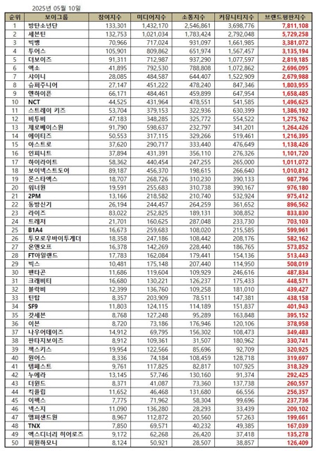 The brand reputation index is an index created through the analysis of big data about brands consumed by consumers' online habits. The analysis of this index can measure positive and negative reviews of boy groups, consumer participation, media coverage, interaction.